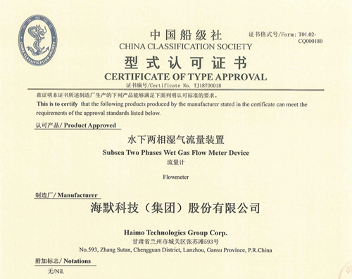 8868体育水下两相湿气流量装置获中国船级社(CCS)型式认证证书